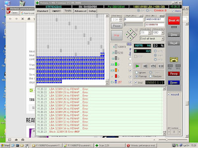 The SMART Drive says "GOOD" (I did not take a screen shot) and yet the Test shows 130 Blue X Errors (hard drive data blocks beyond repair, those screen shots are in yesterday's entry). So I run the Remap feature and after a few minutes, almost the entire drive comes up as error. I stop the test and find out the drive was disconnected. No physical movement of the laptop or anything. So this might be the last entry this laptop allows if I shut it down and reboot because I am not sure if the reboot disk can reboot with no drive in the laptop at all and I am not sure I want to find out the hard way.